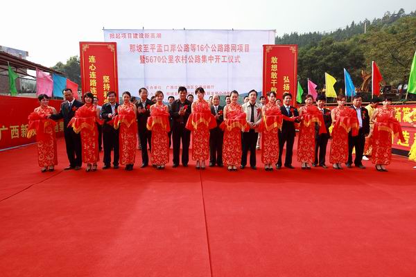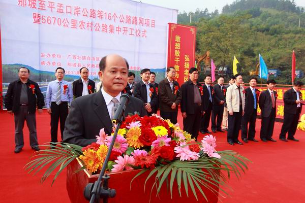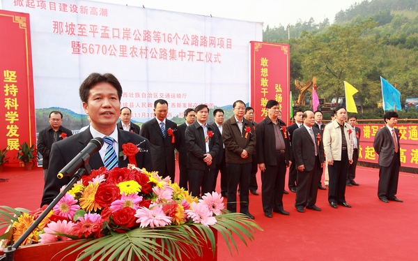 為貫徹落實(shí)自治區(qū)黨委、政府在全區(qū)掀起項(xiàng)目建設(shè)新高潮的決策部署,沖刺第四季度,完成全年公路建設(shè)目標(biāo)任務(wù),自治區(qū)交通運(yùn)輸廳于11月3日舉行全區(qū)公路路網(wǎng)改造項(xiàng)目集中開工儀式。由集團(tuán)公司承辦的分會場——那坡至平孟口岸公路等16個(gè)公路路網(wǎng)項(xiàng)目暨5670公里農(nóng)村公路集中開工儀式在百色市那坡縣德隆鄉(xiāng)隆重舉行。自治區(qū)交通運(yùn)輸廳紀(jì)檢組長、廳黨組成員朱名勝,百色市市委常委、政法委書記周武紅,市人大常委會黨組成員黃五同,集團(tuán)公司黨委書記、董事長朱堅(jiān)和、總經(jīng)理李定倫、黨委副書記張友坐、副總經(jīng)理劉明洪、總工程師覃炳賢,自治區(qū)公路管理局、百色市公路管理局、交通運(yùn)輸局、那坡縣四家班子、集團(tuán)公司直屬各單位領(lǐng)導(dǎo)及有關(guān)部門負(fù)責(zé)人等出席開工儀式。