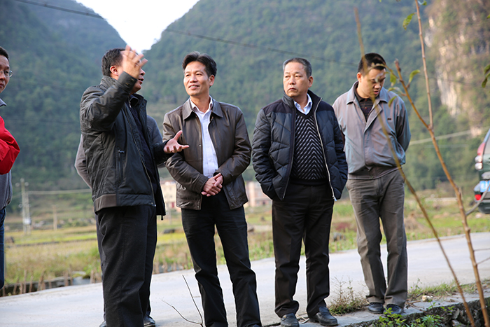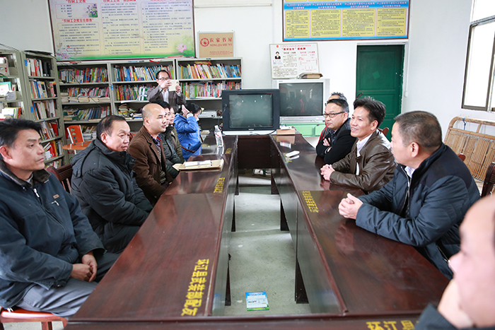 集團公司朱堅和董事長(左三)、張友坐副書記(右一)聽取駐村”第一書記“梁義寬匯報工作。 在相堯村、豹山村、才帛村,朱堅和董事長分別與當(dāng)?shù)劓?zhèn)、村干部以及覃獻康、梁義寬、蔣博三位派駐農(nóng)村“第一書記”和扶貧工作隊隊員進行親切交談,詳細(xì)詢問“第一書記”工作、生活情況,并聽取了“第一書記”關(guān)于幫扶村的黨建及村集體經(jīng)濟發(fā)展情況匯報。得知目前各駐村書記及扶貧工作隊員已經(jīng)完成精準(zhǔn)扶貧入戶摸底調(diào)查時,朱堅和董事長對“第一書記”到村以來,深入調(diào)查走訪,積極幫助村里理思路、定規(guī)劃、辦實事,表示充分肯定。
