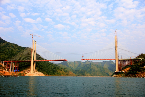 紅水河特大橋是由集團(tuán)直屬企業(yè)廣西路橋工程集團(tuán)有限公司承建的一座雙塔雙索面混合式疊合梁斜拉橋,橋跨布置(213+508+185)米,主塔高