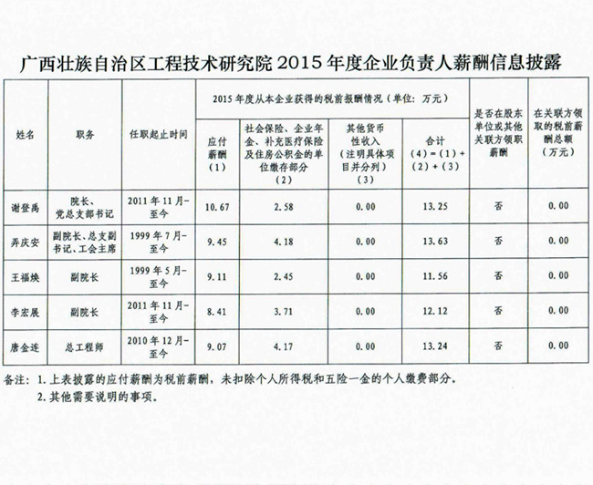廣西壯族自治區(qū)工程技術(shù)研究院2015年度企業(yè)負責(zé)人薪酬信息披露