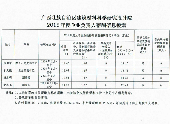廣西壯族自治區(qū)建筑材料科學研究設(shè)計院2015年度企業(yè)負責人薪酬信息披露