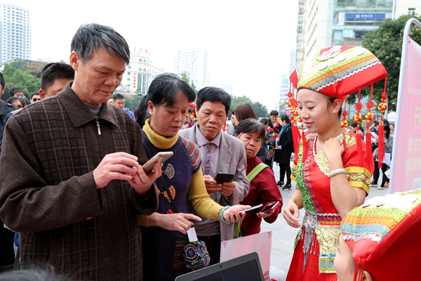 身著統(tǒng)一服裝,肩披綬帶、胸扣團(tuán)徽的ETC推廣青年突擊隊(duì)員向過往的行人宣傳ETC的相關(guān)知識(shí),耐心解答車主朋友們的疑問,并現(xiàn)場演示ETC八桂行卡的安裝過程,使廣大社區(qū)市民對ETC有了一個(gè)初步的認(rèn)識(shí)。6名身著靚麗壯族服飾瞬間吸引住了往來市民的眼光,紛紛前來咨詢業(yè)務(wù)?;顒?dòng)期間,一卡通公司客服人員熱情地向社區(qū)居民發(fā)放了100張“桂民卡·體驗(yàn)卡”,亦有不少市民被桂民卡精美的版面設(shè)計(jì)和強(qiáng)大的互聯(lián)互通功能所吸引,紛紛在現(xiàn)場辦理購卡及充值業(yè)務(wù)。票通公司客服人員則向社區(qū)居民推介了廣西人自己的道路客運(yùn)網(wǎng)絡(luò)售票平臺(tái)——“桂客行”,耐心地向市民解析平臺(tái)功能、覆蓋范圍等,并協(xié)助市民下載“桂客行”手機(jī)APP。