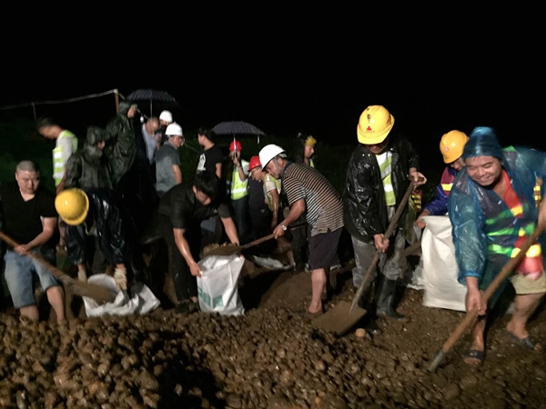 “十萬壟大堤出現(xiàn)險情,大家快去救援?!?月1日21時,湖南省湘潭市,廣西路橋集團(tuán)環(huán)東路項目經(jīng)理部項目常務(wù)副總工程師宋佩超立即組織項目經(jīng)理部員工一起奔赴一線。當(dāng)時湘潭市十萬壟湘江大堤出現(xiàn)直徑約20公分左右管涌,情況十分緊急,附近的新馬路項目部出動挖掘機(jī)和裝載機(jī)進(jìn)行搶險救援。同時,項目經(jīng)理部全體員工與當(dāng)?shù)鼐仍犖橐黄鹋牌鹆碎L龍,齊聲喊著口號“一二”、“一二”裝沙袋、傳運(yùn)沙袋,幫助封堵大堤漏洞。