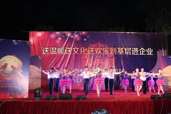 晚上,自治區(qū)總工會安排了豐富多彩的慰問演出。整場演出以“勞動托起中國夢”為主題,載歌載舞,奏響勞動光榮的時代主旋律。慰問演出在富有壯族文化風情的《廣西尼的呀》的舞蹈中拉開了序幕,既有《力與美》的高難度雜技表演,又有詼諧幽默、勵志感人的小品《為愛加油》,配樂詩朗誦《心儀廣西》展示了廣西壯鄉(xiāng)的山好水好前景闊,更有優(yōu)美的舞蹈《魅影》、《工匠精神》等節(jié)目更是歌頌了勞動之美。路橋集團員工還帶來配樂詩朗誦《萬里征程品為本,行穩(wěn)致遠前景闊》和小品《工地愛情故事》,展現(xiàn)了路橋職工的風采。慰問演出在歌舞《不忘初心》中畫上了圓滿的句號,路橋建設者們在這場文化盛宴中度過一個難忘的夜晚。