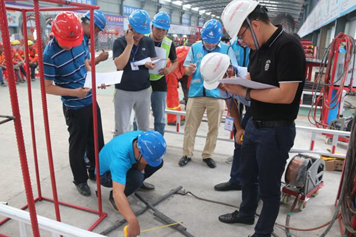 本次比賽采用Ф28鋼筋作為焊接母材,共分為單面平焊、立焊、仰焊三個比賽項目,每位參賽選手需在規(guī)定時間內按照比賽要求焊接一組試件。評委按照鋼筋焊縫長度、焊縫深度、焊縫寬度、焊接時間、是否有咬邊、焊接平整度、焊接成型等幾個方面進行評分。