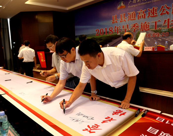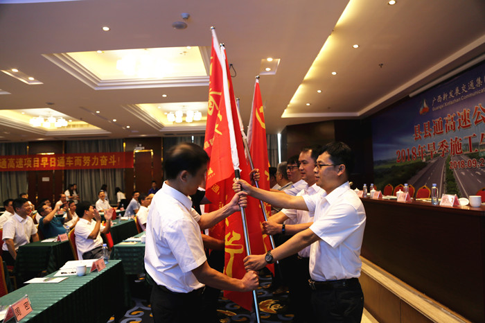 會上,與會領(lǐng)導(dǎo)為各參建單位代表授“黨員先鋒隊(duì)”及“青年突擊隊(duì)”旗子。會上還開展了旱季施工質(zhì)量安全承諾簽字活動(dòng)。